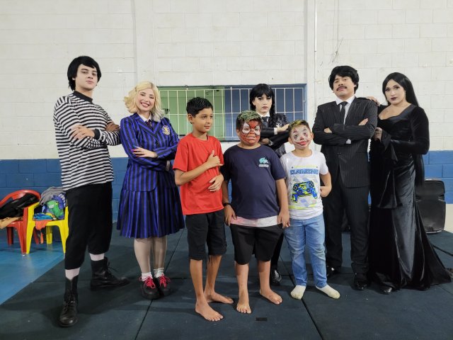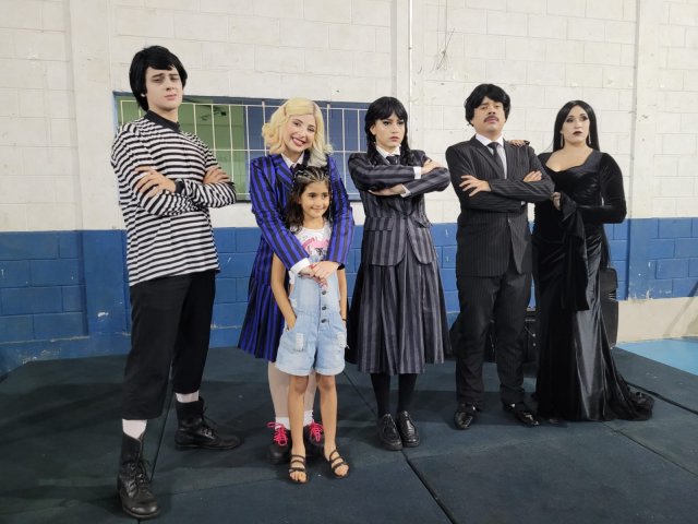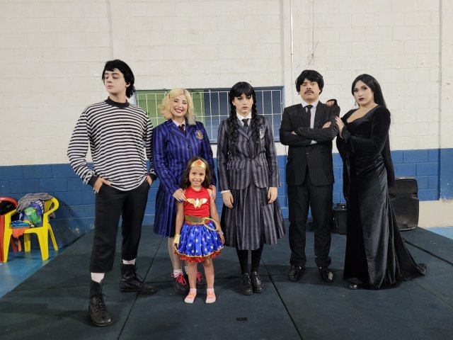 Até a “Família Addams” apareceu por lá e cantou parabéns junto ao bolo personalizado, oferecido pela Lanchonete Santa Isabel. A “empolgação” da Wandinha nesse momento foi uma atração à parte (rsrs).