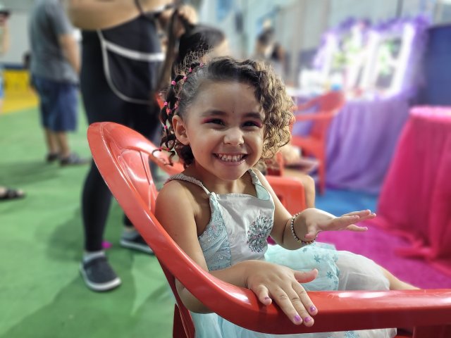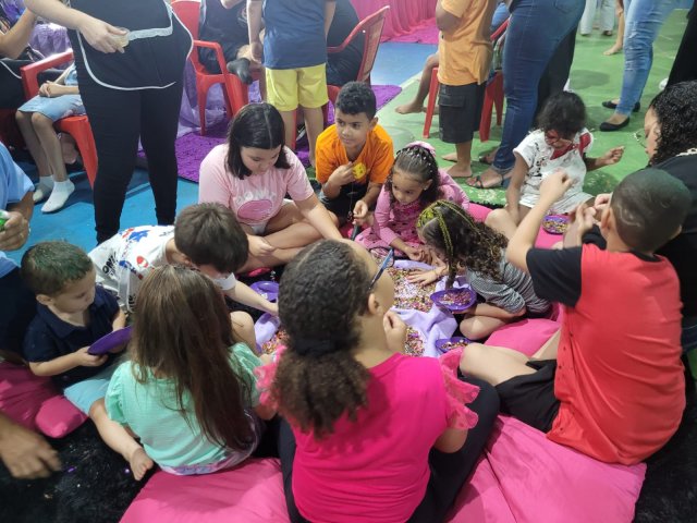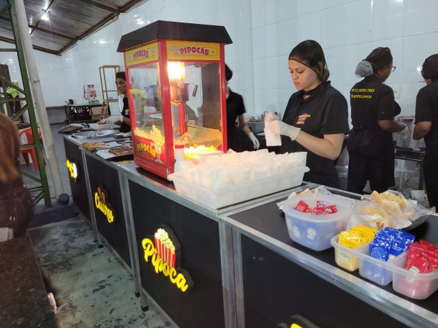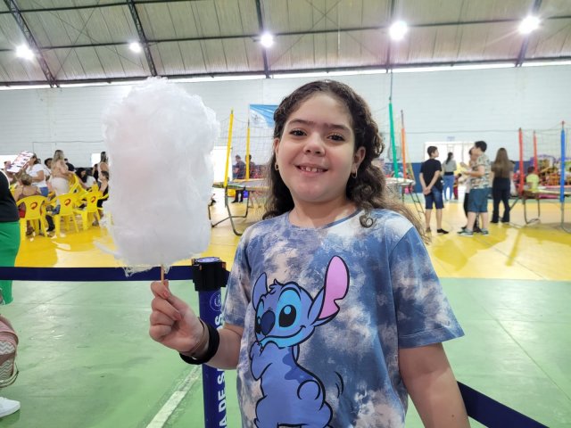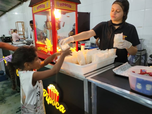 Para dar energia, tinha cachorro quente, pipoca, churros e algodão doce. Aliás, haja energia para os pais, porque a criançada pegou fogo com tanto entretenimento.