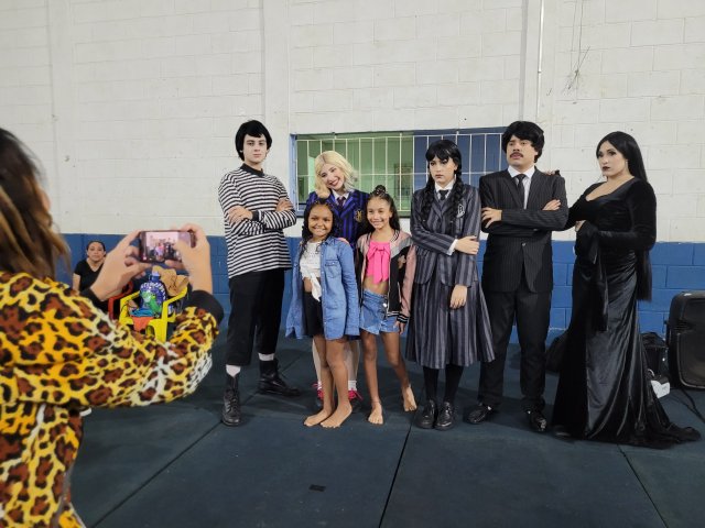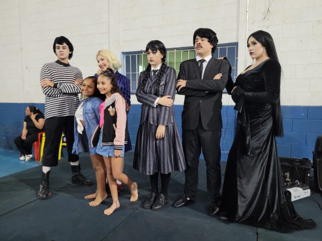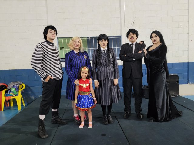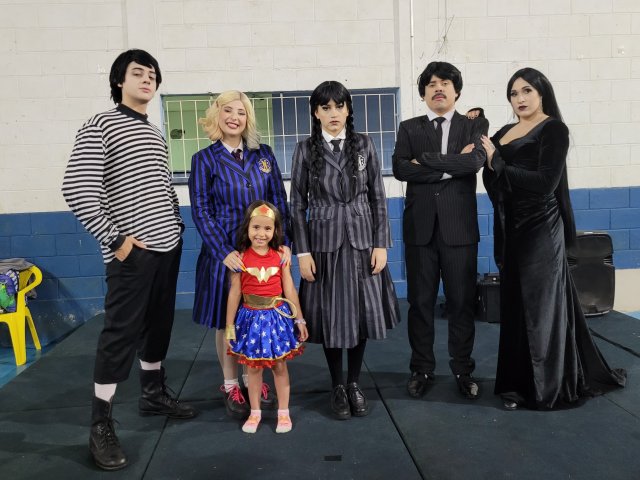 Até a “Família Addams” apareceu por lá e cantou parabéns junto ao bolo personalizado, oferecido pela Lanchonete Santa Isabel. A “empolgação” da Wandinha nesse momento foi uma atração à parte (rsrs).