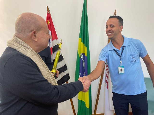 Líder da equipe, Thiago Santos, entrega troféu do 2º Torneio Vida Nova ao provedor da Santa Casa de Santos.